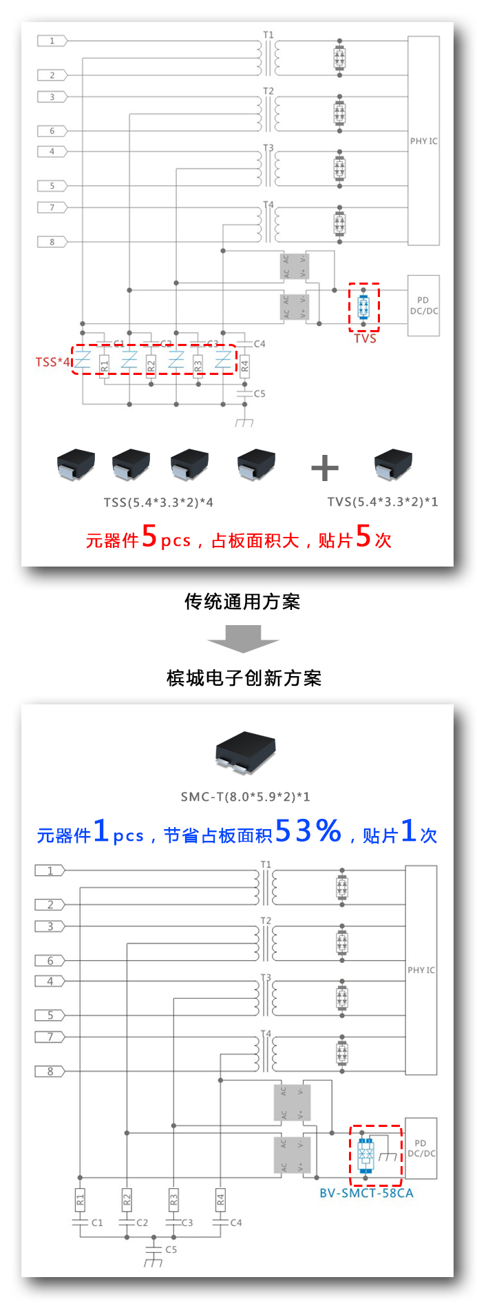 該優(yōu)化方案適用于所有有POE浪涌防護(hù)需求的設(shè)備,防護(hù)等級(jí)對(duì)應(yīng)方案向下兼容。方案具有使用簡單,殘壓低,占板空間小、高性價(jià)比等特點(diǎn)。單顆集成的BV-SMCT-58CA功率大,余量足且體積非常小,響應(yīng)速度快,大大提升防護(hù)效率。