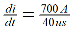 以浪涌1.2/50us-8/20μs 2Ω,6KV 3KA浪涌測試標(biāo)準(zhǔn)為例。假設(shè)MOV殘壓在150V,TVS殘壓期望控制在90V(圖2),TVS的IPP 只有700A。假設(shè),鉗位電壓的脈沖寬度40μs(實(shí)測),電感的電流變化40μs內(nèi)應(yīng)該小于700A, ,電感的電流變化率應(yīng)該小于17.5A/μs(圖3)。