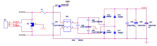 2: 針對此AC24V電源方案,由于其采用了DC-DC芯片轉(zhuǎn)換,所以整流橋負(fù)極性的地與后極數(shù)字地是必須相連的,這與FlyBack電路不同,所以其防護(hù)設(shè)計需要特別考慮從數(shù)字地通過整流橋到接口的路徑。
