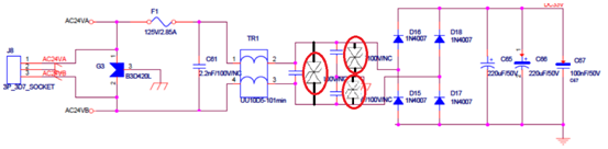 新問題:優(yōu)化保護(hù)方案后,測試AC24VB線時出現(xiàn)整流橋燒毀,更換整流橋后工作正常,DC-DC芯片正常。