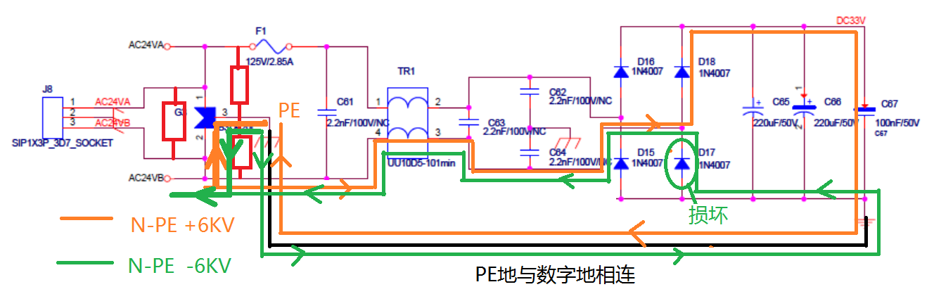 如上圖黃色所示為N-PE +6KV測試時的能量流經(jīng)圖,大能量從AV24VB開始大部分通過TVS管泄放到地,另一部分能量通過后極整流橋D18通過DC33V與地的電容流經(jīng),由于電容隔離在,因此后極泄放的能量很小,不至于把整流橋搞壞。測試結(jié)果為通過。